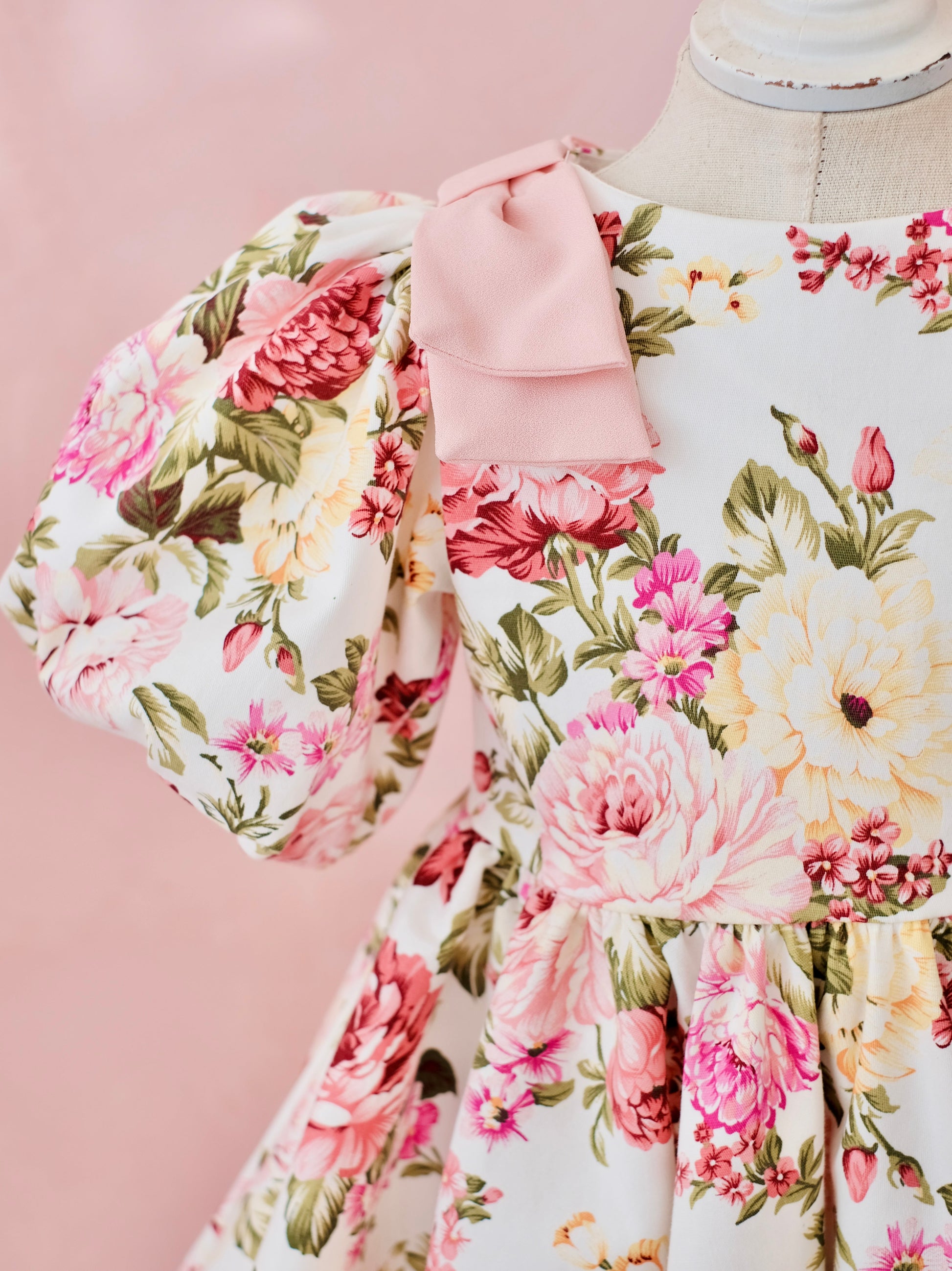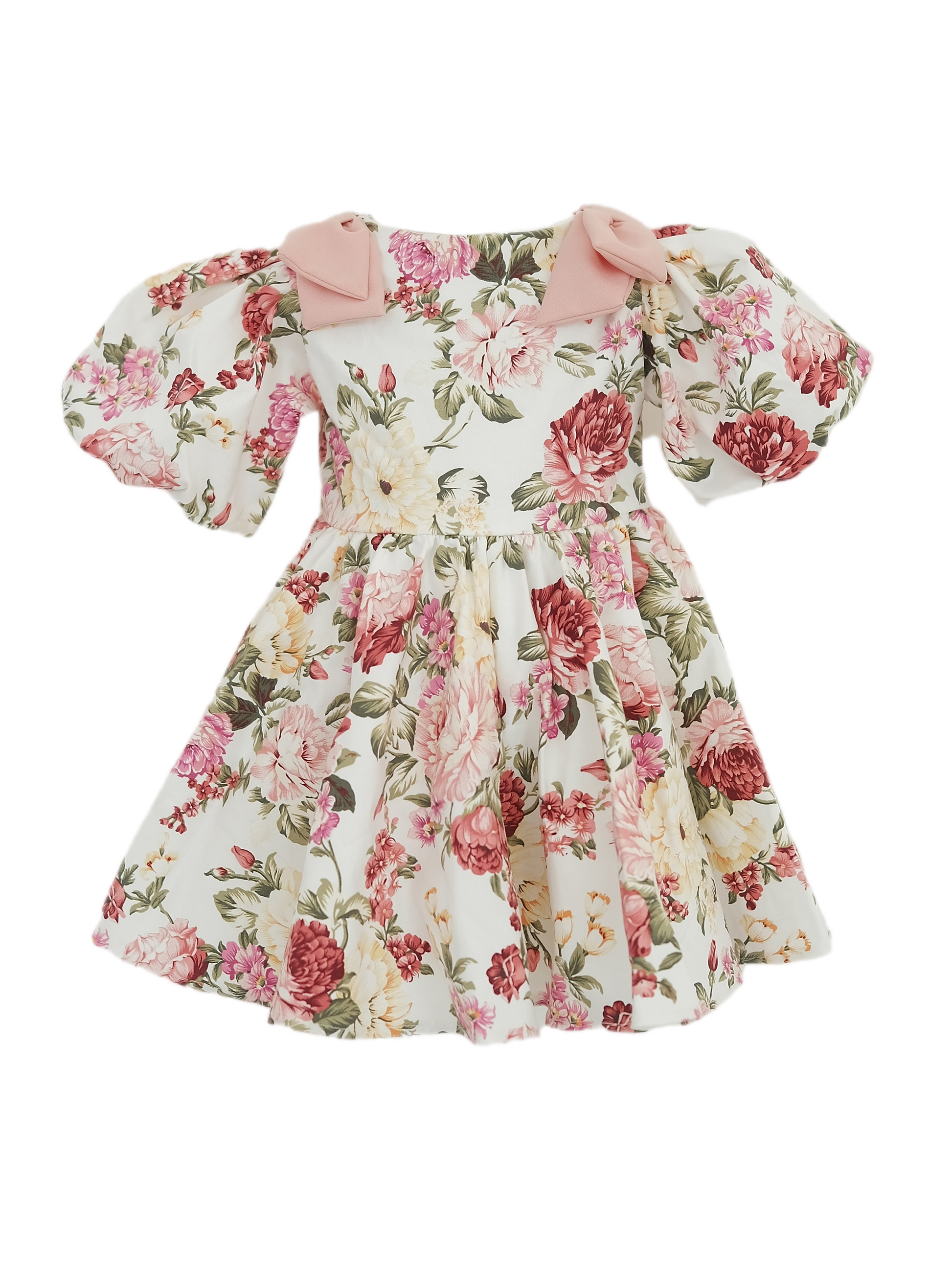 This soft twill dress is designed with a cotton lining, puffed sleeves, and a full circle skirt silhouette. It also includes an extra layer of tulle for added volume, while the sleeves are adorned with a charming bow detail. This dress is sold solo. Headpieces and additional styling elements are not part of the listing or must be purchased separately.