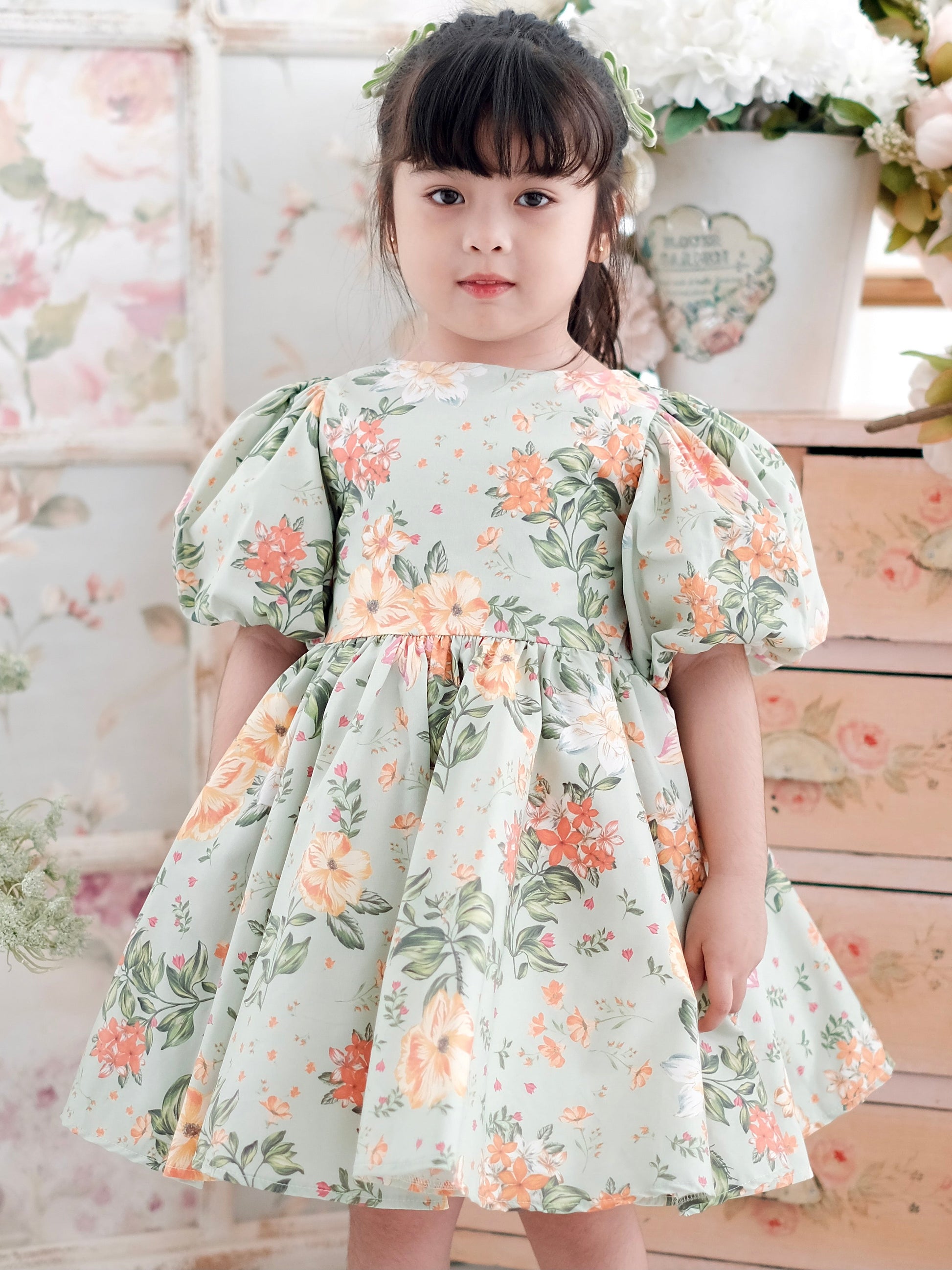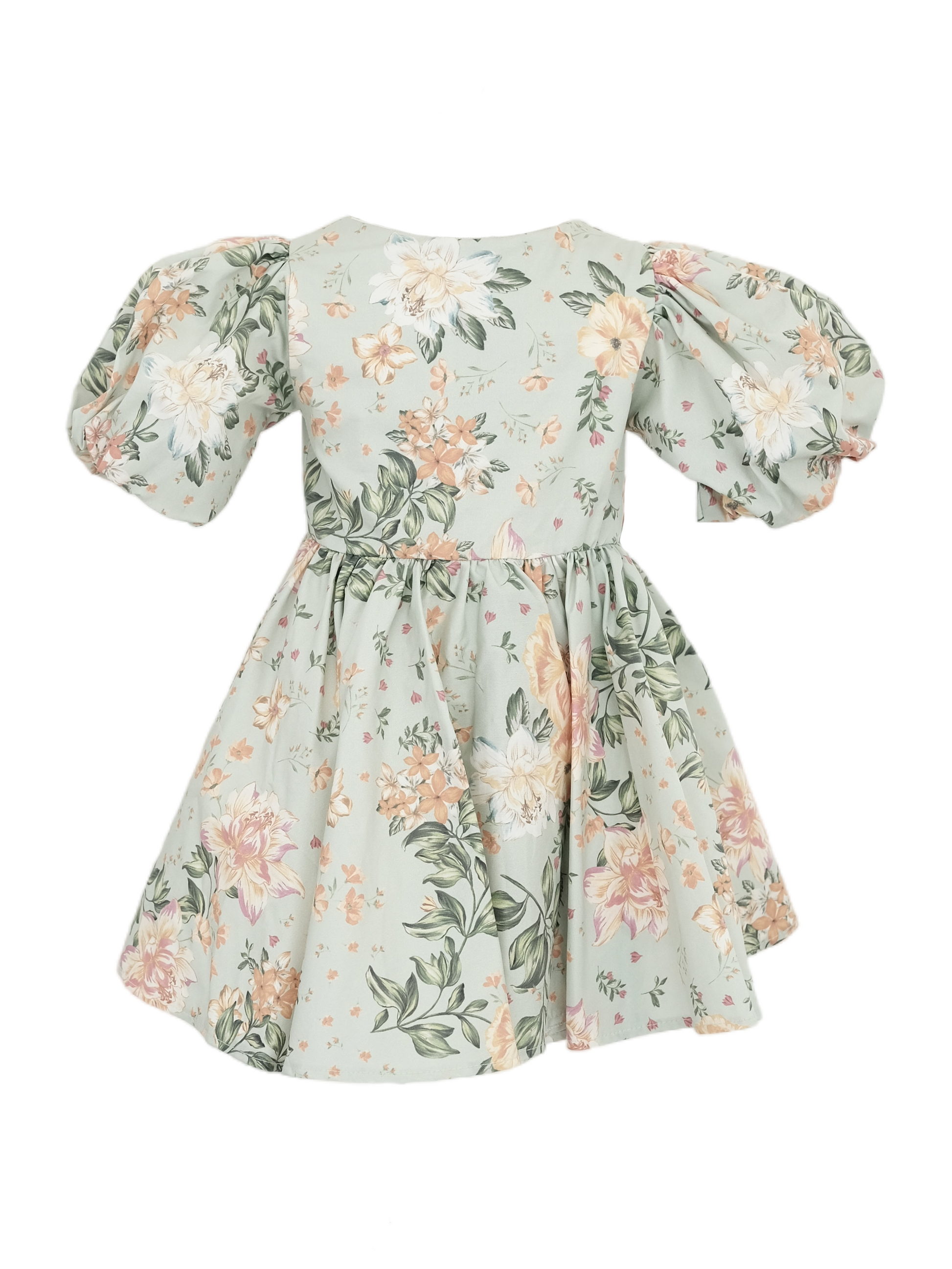 Dainty floral dress crafted from floral printed cotton and soft voile- features fully lined interior, puffed sleeves, full circle skirt layered with tulle for extra puff and distinctively accentuated with a large bow.
