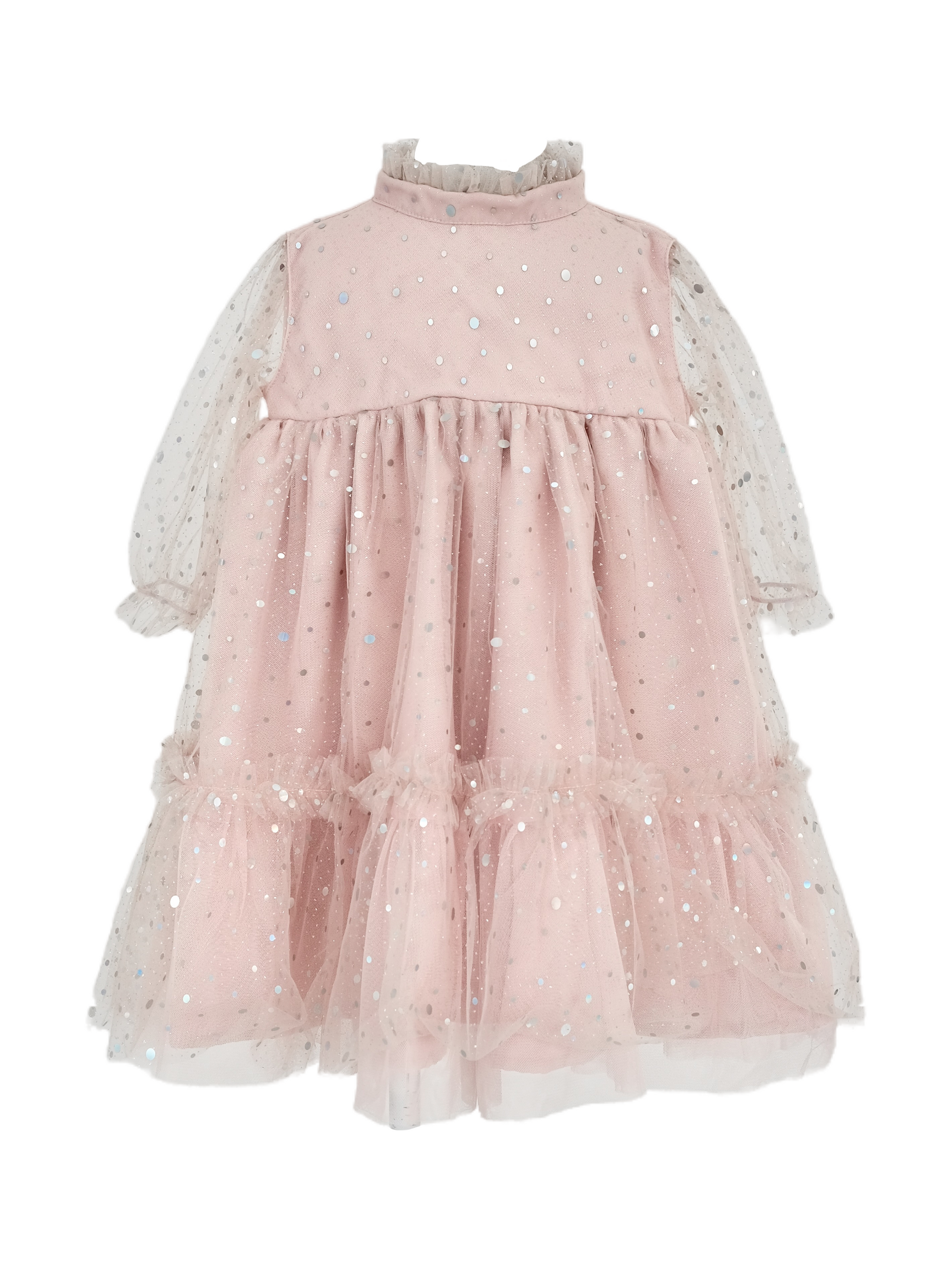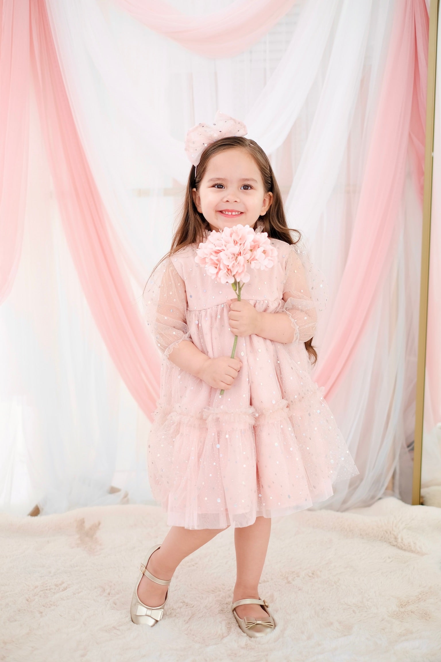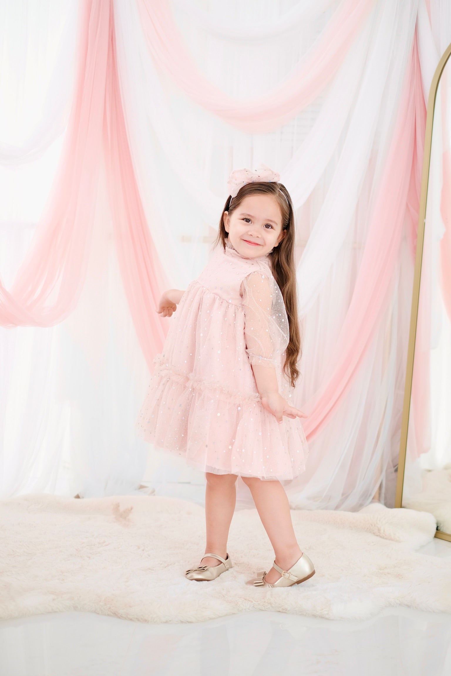 Limited edition sparkly version of a beloved fave- This statement making doll dress is crafted from layers of sparkle tulle, soft tulle and neocrepe lining. The flounce hem and matching headpiece makes for a comfy and cute combination. Dress comes with a matching soft headband with sparkle bow (toddler sizes) and headband (kids sizes)