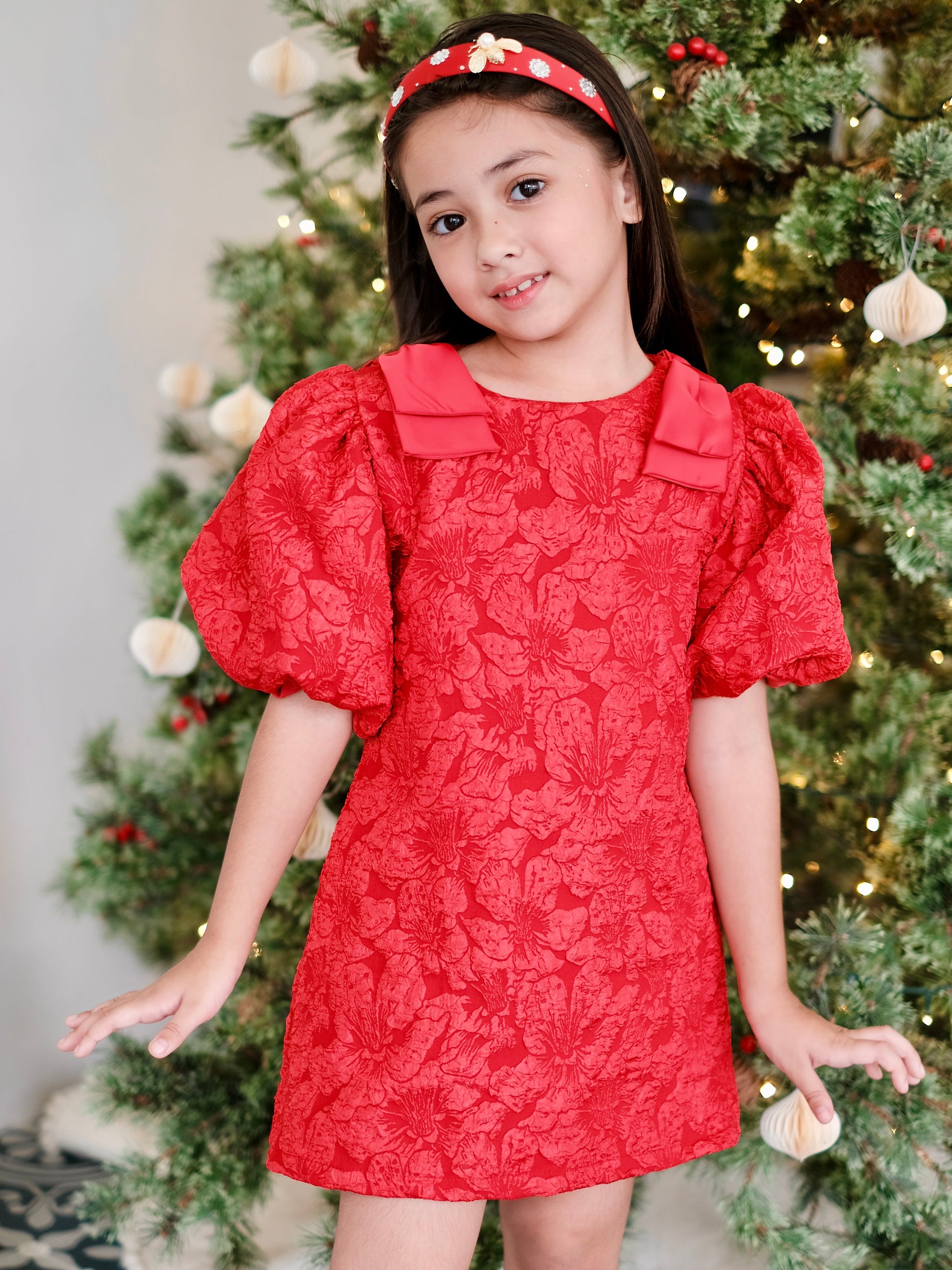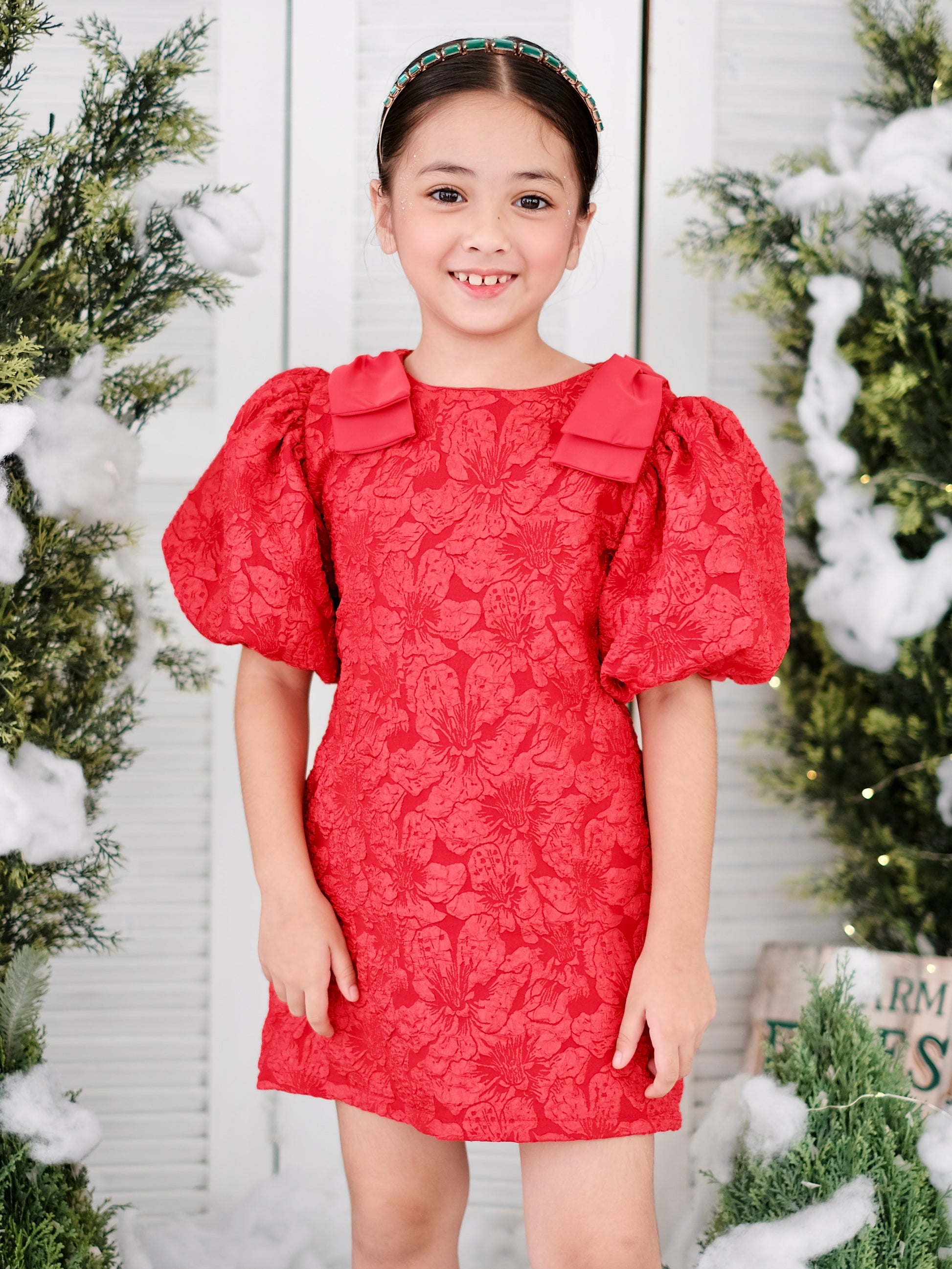 Elegant celebration dress in comfy swing silhouette. Crafted from textured jacquard fabric with cotton lining for comfort. Finishing touches include a back zipper fastening, bow on shoulders and stylish puff sleeve detailing for elegance.